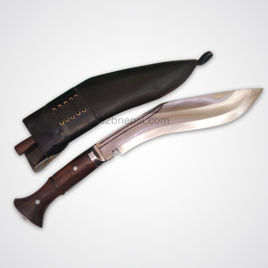 Its polished blade carries the iconic inward curve of Nepali Kukuri, making it effective for cutting, chopping, and utility work, while also remaining a prized collectible. The handle is typically made from hardwood or horn, shaped for a comfortable grip and finish with traditional element that enhance both beauty and function.