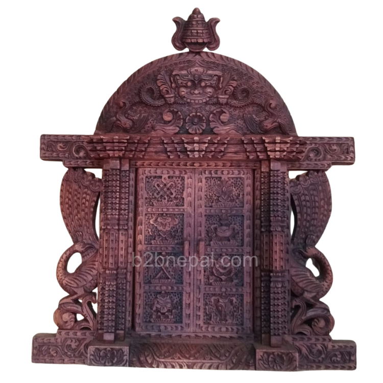Nepalese wood carving is renowed for its intricate designs, fine craftsmanship, and spiritual symbolism. This door replica is made from Sal wood and has a rich mahogany color. The door has hinges and can be opened and closed. This product is fully handmade by wood carvers in Kathmandu valley.