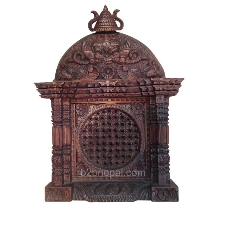 An intricately carved replica of Nepalese traditional Ankhi Jhyal or Tiki Jhya. The lattice window pattern is carved by hand by skilled craftsmen with an image of Cheppu, the guardian figure in Newari culture.